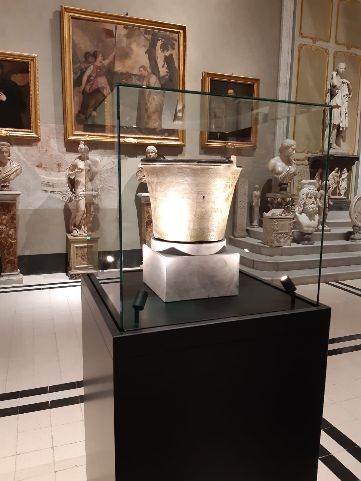 Progettazione e realizzazione di una teca espositiva per Secchia in bronzo appartenente alla collezione della Galleria Doria Pamphilj di Roma. La teca è composta da una base in silestone e una copertura in vetro museale, extrachiaro e antiriflesso, con un ripiano interno che contiene uno stabilizzatore di umidità relativa che previene eccessive fluttuazioni. La teca si presenta completa di faretti in led orientabili e un plinto rivestito in velluto grigio sul quale è stata posizionata la Secchia.